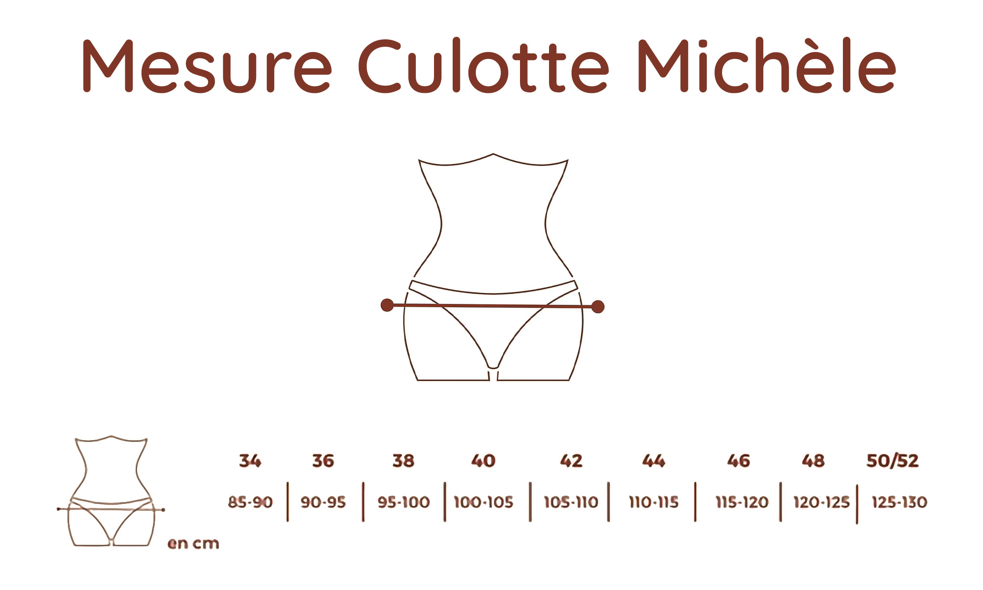 Si vos mesures se situent entre deux tailles, il est recommandé de choisir l’Olympe dans la taille au-dessus pour éviter que la culotte soit trop ajustée.