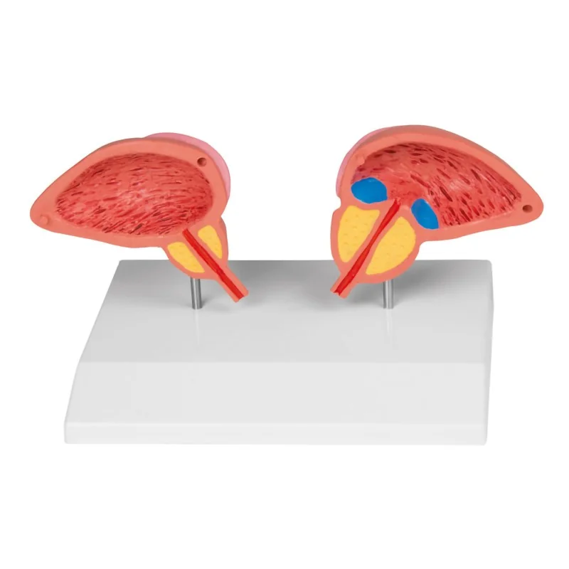 Ce modèle anatomique présente une prostate fractionnée en deux moitiés montée sur un support amovible. L’une des moitiés montre une prostate sainement normale avec vessie, tandis que l’autre révèle une hypertrophie bénigne de la prostate (HBP) provoquant un rétrécissement de l’urètre et une urine résiduelle. Le modèle mesure environ 20 × 9 × 13 cm, ce qui le rend facile à exposer ou à transporter dans un cadre pédagogique ou clinique.