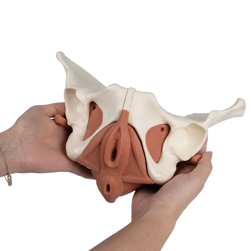Ce modèle détaillé représente un bassin féminin avec sacrum et plancher pelvien féminin découpé en douze parties détachables grâce à des aimants. Sont inclus les muscles suivants : les deux obtruateurs internes, les deux piriformes, les deux coccygiens, le diaphragme pelvien (puborectal, pubococcygien, ilio-coccygien), le diaphragme urogénital (transversus profond et superficiel du périnée, ischiocaverneux), ainsi que les sphincters externe de l’anus, de l’urètre et le muscle bulbospongieux. Le modèle mesure environ 27 × 18 × 17 cm, et pèse environ 960 g, ce qui le rend suffisamment grand pour étude visuelle détaillée tout en restant maniable.