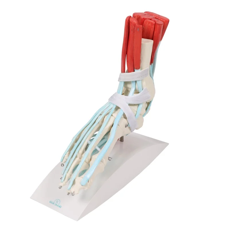 Ce modèle représente le squelette complet du pied humain taille nature, avec les ligaments et les muscles associés, monté sur un trépied amovible. Tous les os du pied sont séparés, de même que le début du tibia et du péroné, ce qui permet d’observer précisément la structure osseuse. Les muscles et ligaments suivants sont représentés : flexor digitorum longus, tibial postérieur, flexor hallucis longus, peroneus longus, peroneus brevis, extensor hallucis longus, extensor digitorum longus, tibialis anterior, rétinaculum musculorum peroneorum superius, rétinaculum extensorum inferius, soleus, flexor digitorum brevis. Le modèle est livré avec une Key Card multilingue (latin, anglais, allemand) pour référence anatomique.