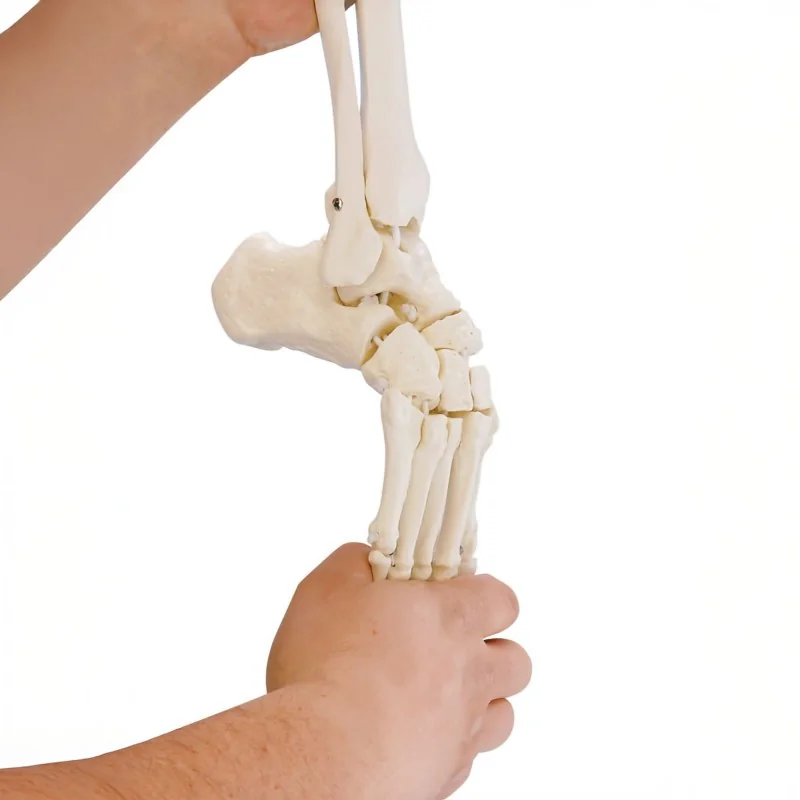 Ce modèle est un moulage fidèle d’un pied humain taille naturelle, incluant l’insertion du tibia et du péroné. Le pied est monté sur caoutchouc flexible, ce qui permet de démontrer le mouvement de roulement (roulis) de manière réaliste. Toutes les structures osseuses du pied sont visibles, permettant d’étudier les articulations, les os tarsiens, métatarsiens et les phalanges. Usage professionnel pédagogique recommandé, non jouet, adapté à partir de 14 ans.