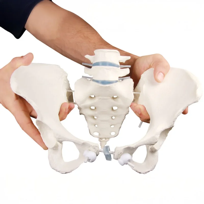 Modèle d’empreinte naturelle du bassin féminin adulte qui comprend les os iliaques, le sacrum démontable ainsi que les vertèbres lombaires L1 et L2 montées de manière souple. Ce modèle permet de démontrer les mouvements de l’articulation ilio-sacrale, grâce à la souplesse des attaches, et constitue un outil efficace pour la formation médicale ou la démonstration clinique.