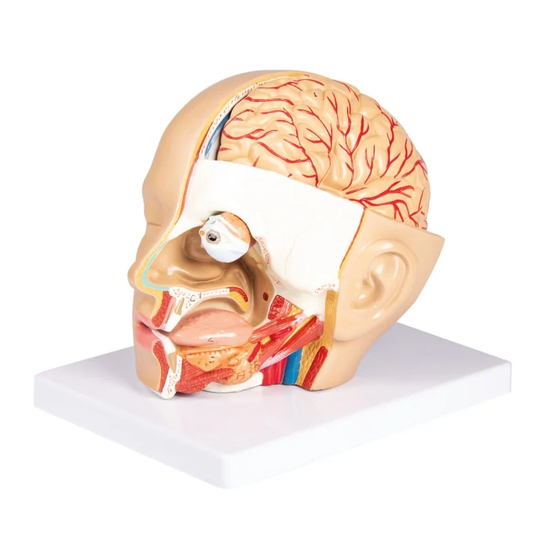 Ce modèle représente une tête humaine taille réelle divisée en quatre parties démontables. Le côté gauche du visage est coupé selon un plan sagittal et horizontal afin de montrer les structures internes du crâne, du cerveau, ainsi que les cavités nasales et orales. Les pièces amovibles incluent la moitié du cerveau avec ses artères visibles, la moitié du cervelet, et l’œil gauche avec le nerf optique. Dimensions : environ 21 × 15 × 16 cm, poids ≈ 1 kg, socle inclus pour maintien stable.