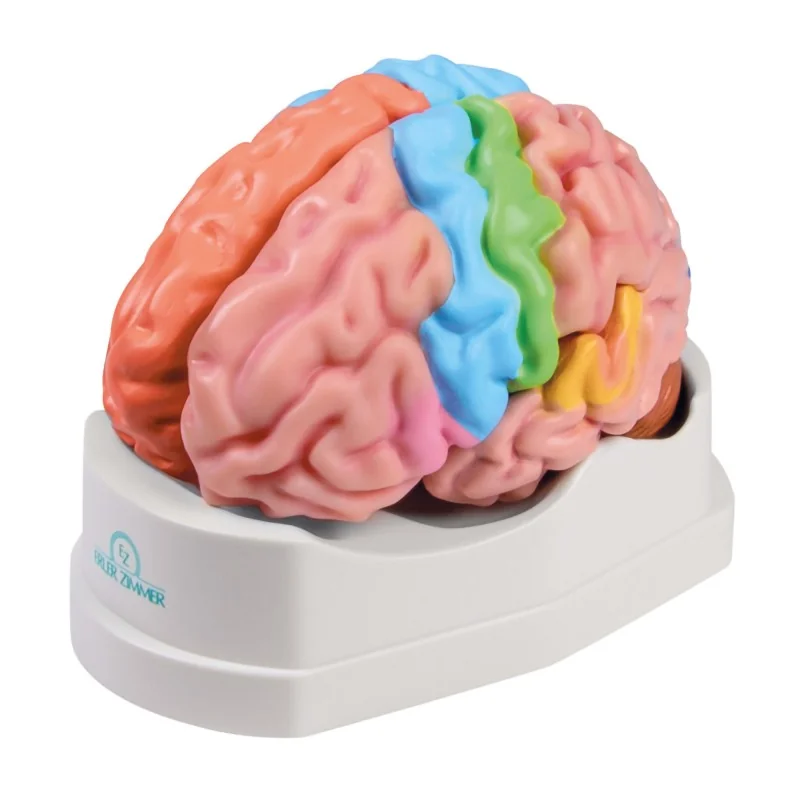 Ce modèle de cerveau grandeur nature est peint avec soin pour distinguer clairement les principaux lobes anatomiques et les zones fonctionnelles corticales. La moitié droite est peinte pour illustrer les quatre lobes du cerveau : frontal, pariétal, temporal et occipital. La moitié gauche se divise en quatre parties : le lobe frontal avec pariétal, le lobe temporal avec occipital, le tronc cérébral et le cervelet. On y retrouve également les zones corticales importantes : le cortex moteur primaire, le cortex sensoriel, le cortex visuel, l’aire de Broca (langage moteur), le cortex auditif et l’aire de Wernicke (compréhension du langage).