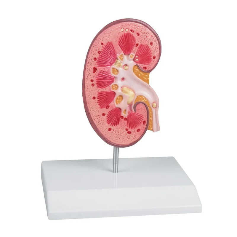 Ce modèle anatomique représente un rein droit ouvert à taille réelle, conçu pour illustrer et expliquer les calculs rénaux (urolithiases). Le bassinet, les calices rénaux et l’uretère sont ouverts afin de mettre en évidence des dépôts de calculs dans les zones typiques : calice supérieur, tubule connecteur du groupe de calices inférieur, cortex rénal, pyramides rénales et uretère. Monté sur un socle stable, ce modèle pèse environ 200 g, combinant maniabilité et robustesse pour un usage pédagogique ou clinique.