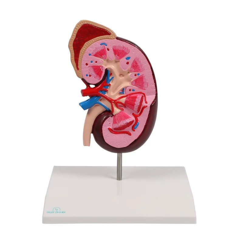 Ce modèle représente un rein humain agrandi 2× par rapport à sa taille naturelle, avec des détails peints à la main. Il montre le bassinet, la médulla (zone médullaire), les calices, le cortex, les artères et veines rénales, l’uretère ainsi que les capsules surrénales. Livré avec une carte didactique et un support stable, il est idéal pour la formation ou la démonstration. Dimensions : ≈ 16 × 10 × 5 cm ; poids ≈ 270 g.