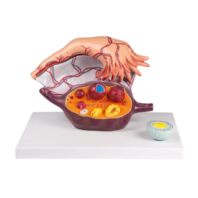 Modèle anatomique en deux parties, agrandi 5× par rapport à la taille naturelle, présentant l’ovaire et la trompe de Fallope. Les follicules sont visibles à plusieurs stades de maturation, du follicule primaire jusqu’au corps albicans. Un follicule primaire est sectionné pour révéler sa structure interne (ovocyte, zone pellucide, cellules de la granulosa). Taille : ≈ 33 × 22,5 × 21 cm ; poids : ≈ 1,4 kg.