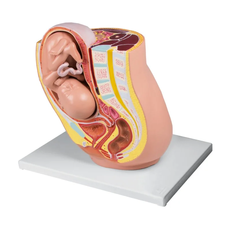 Modèle grandeur nature du bassin féminin en coupe médiane avec un fœtus à la 32ᵉ semaine en position normale. Le fœtus est détachable pour un examen plus poussé, et les organes internes sont visibles en relation précise avec le squelette du bassin. Livré monté sur socle, il permet de visualiser la position, la taille et les proportions du fœtus ainsi que des structures maternelles à ce stade avancé de grossesse.