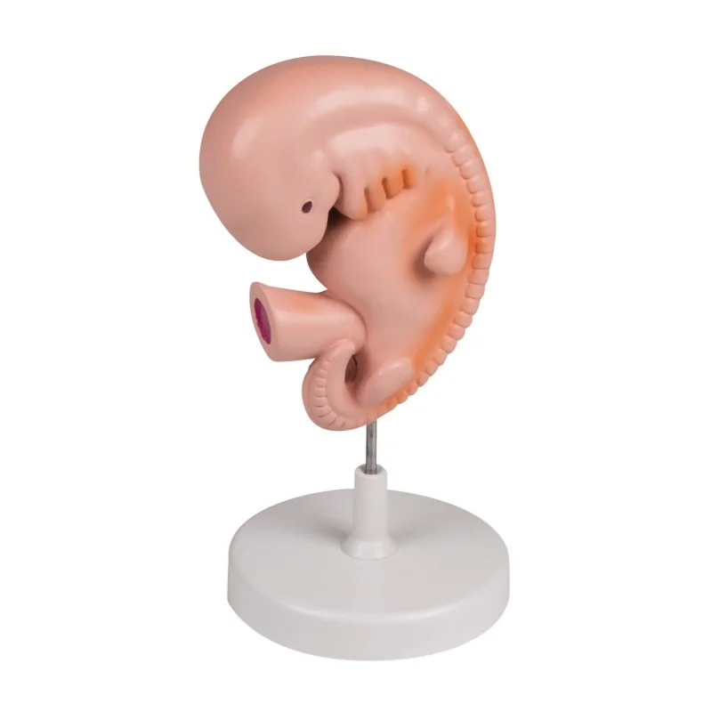 Ce modèle représente un embryon humain à 4 semaines de développement, grossi d’environ quarante fois sa taille naturelle, afin de montrer clairement les détails structurels embryonnaires précoces. On y distingue les bourgeons des membres, le tube neural, le cœur primitif, l’étape initiale de formation des organes, et la courbure corporelle caractéristique à ce stade. Le modèle pèse environ 500 g et offre une visualisation suffisamment grande pour un usage pédagogique ou démonstratif, sans perte de finesse.